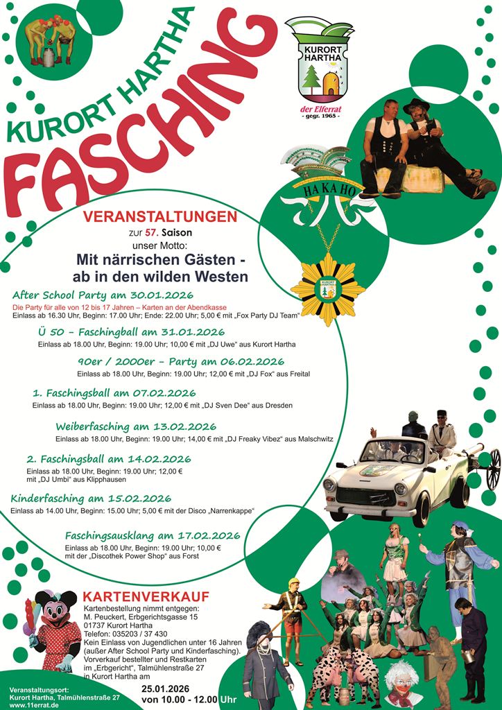 Der Kartenverkauf und die Abholung bestellter Karten findet am 25.01.2026 von 10.00 - 12.00 Uhr im Vereinshaus "Erbgericht", Talmühlenstraße 27 in Kurort Hartha statt.